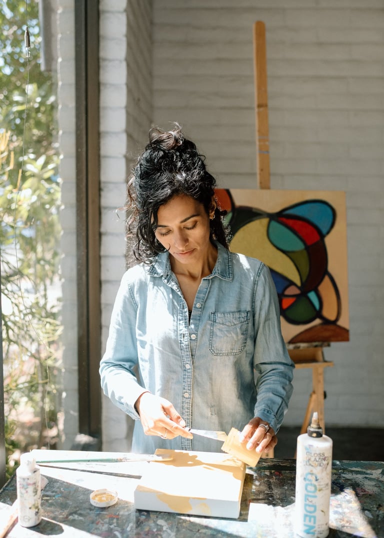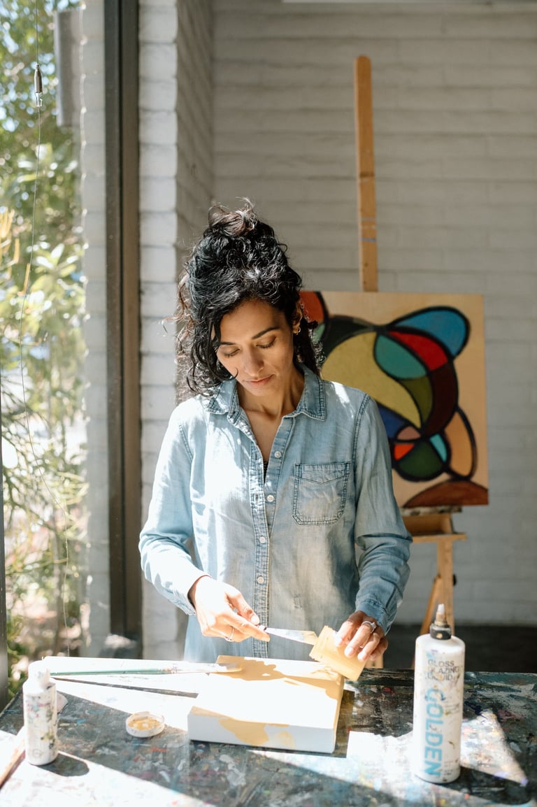 Priyanka Pathak paints in the ancestral homeland of the Kumeyaay, the indigenous people of San Diego County, CA, USA and northern Baja California, Mexico. Priyanka primarily works with acrylics, including in mixed media excursions. In the realm of abstract art, she uses seemingly simple shapes and organic forms to play within the tensions of chaos and order, occasionally incorporating found objects. In portraits and still life studies, she glorifies her subjects' confidence and vulnerability. Her body of work can be described as bold, evocative, and rich. Whether she is creating something purely abstract or undoubtedly realistic, she enjoys pushing past her limits through experimentation, innovation, and creative risk-taking.